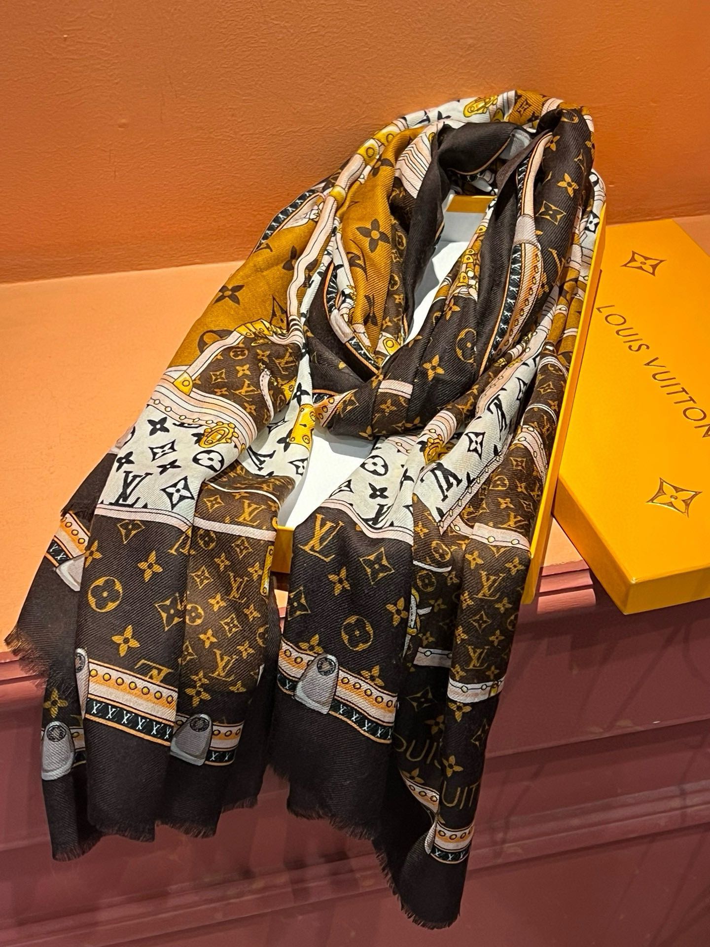 上新L 24最新款??顶级设计太美了,真心赞???实物真心美 ?披肩配以印花???无论设计喷绘都是非常到位??细节都可见?整个围巾给人大牌气场的同时又非常精致高端?VI ??推荐??绝对值得入手?尺寸:100x200cm,材质:羊绒
