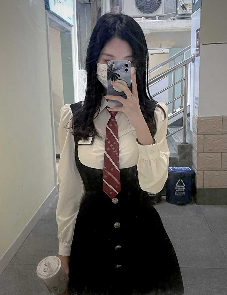 美式假两件甜辣学院风收腰显瘦连衣裙女秋冬长袖衬衫新款套装